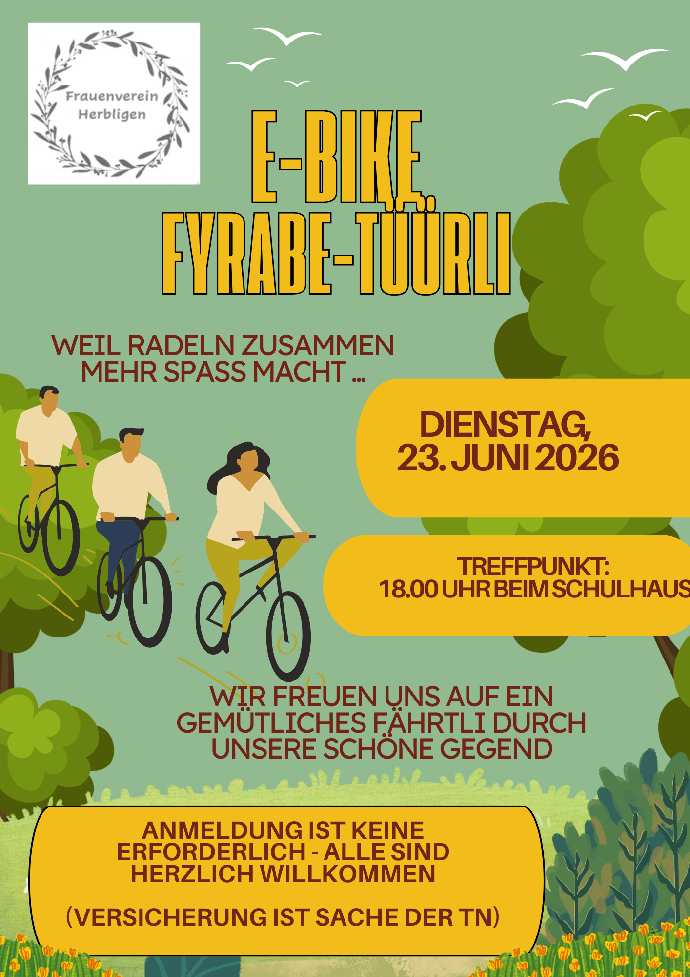 Frauenverein Herbligen; E-Bike Fyrabe-Tüürli, 23.06.2026 Datum 23. Juni 2026 Zeit 18:00 - 21:00 Frauenverein Herbligen, E Bike Fyrabe-Tüürli, 23.06.2026Herunterladen