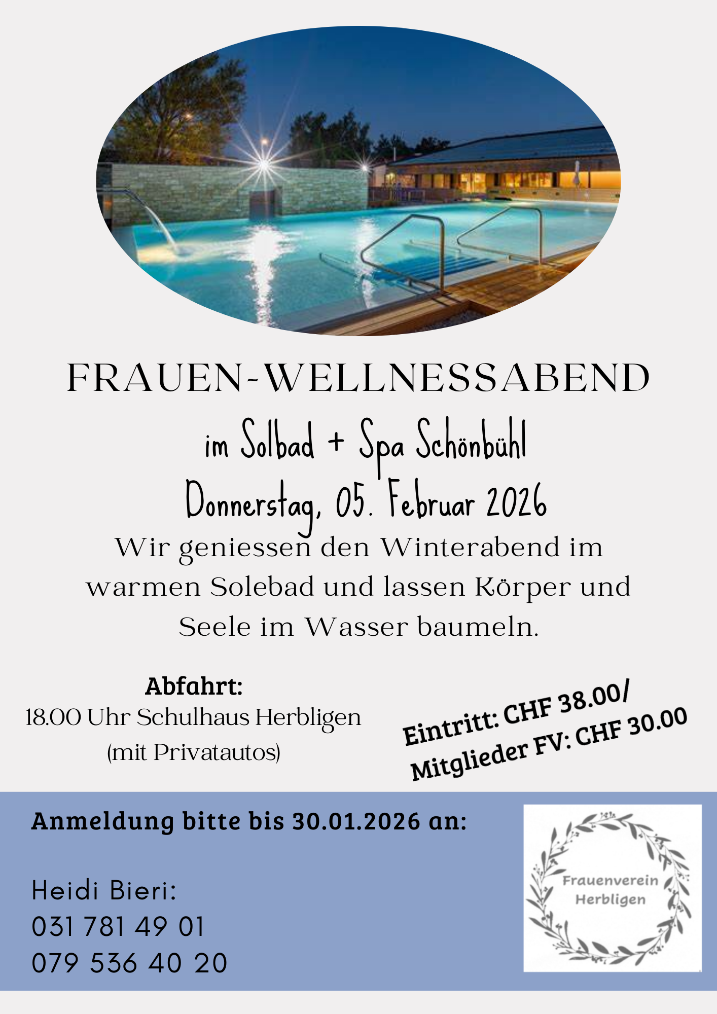 Frauenverein Herbligen; Frauen-Wellnessabend im Solbad&Spa Schönbühl, 05.02.2026 Datum 5. Februar 2026 Zeit 18:00 - 23:00 Frauen-Wellnessabend (5)Herunterladen
